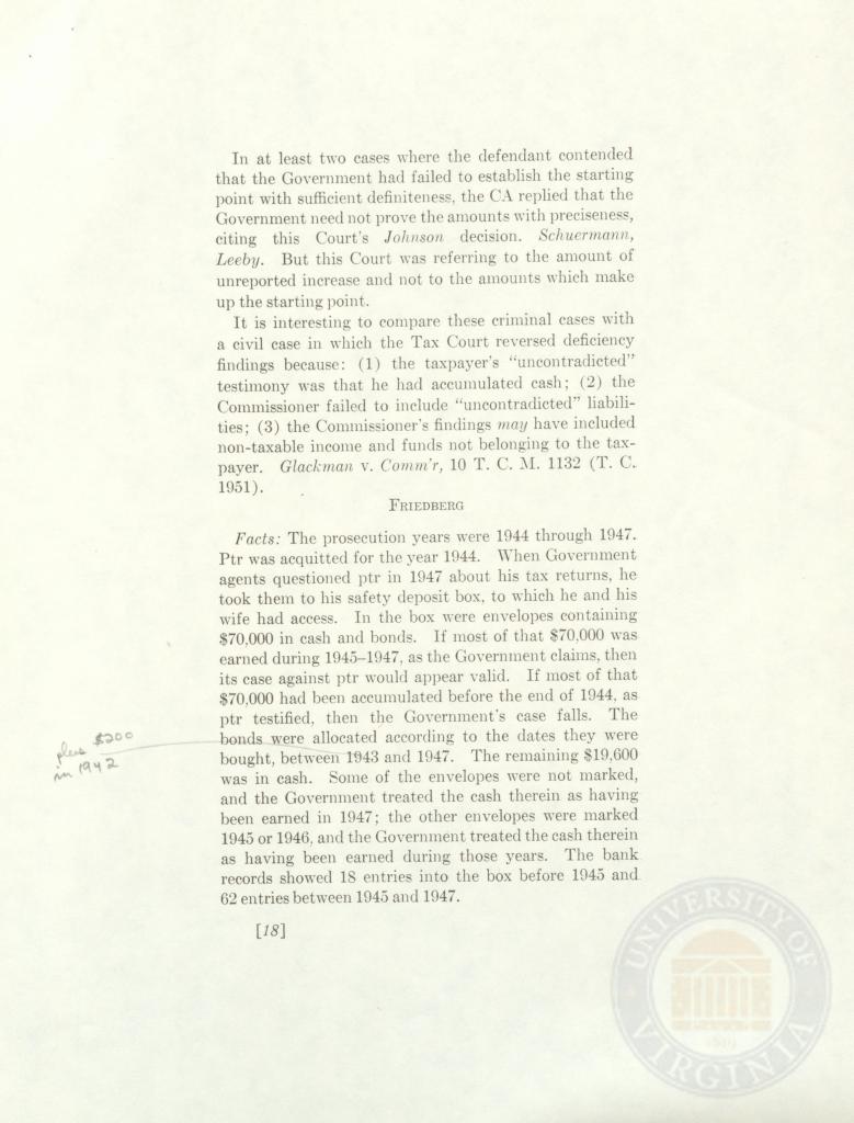 Printed memorandum by E. Barrett Prettyman, Jr., with an introduction by Justice Frankfurter, regarding the net worth cases considered by the court during 1954. Includes marginalia in Prettyman's handwriting (note the marginalia are not reflected in the transcription). 25 May 1954.