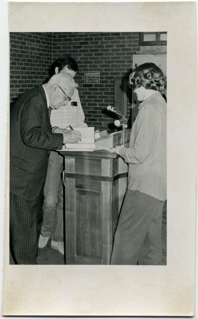 Dumas Malone, noted autobiographer of Thomas Jefferson and winner of the Pulitzer Prize for his six-volume masterpiece on Jefferson's life and times, signs a book for some students. Undated.