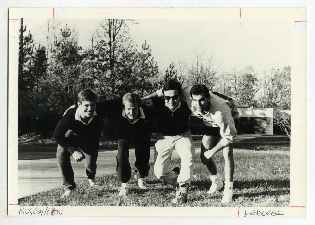 The Law School Rugby Club, 1984-85. Left to right: C. Harkrader, D. Granger, T.J. Della Pietra, and J. Grasso.