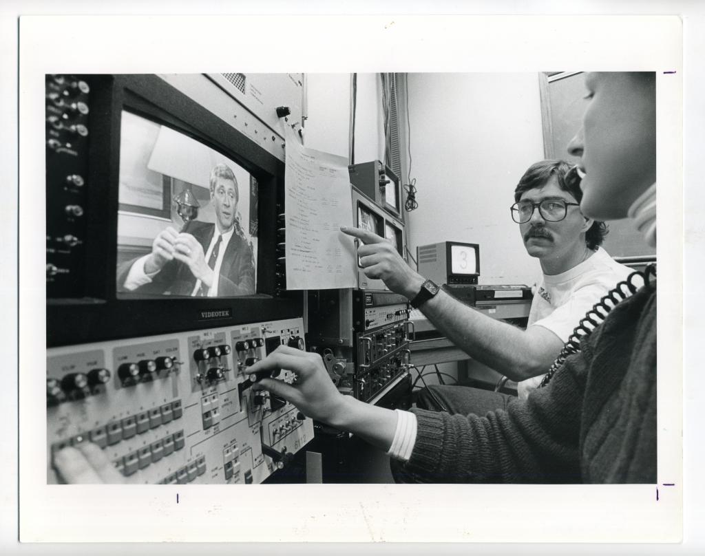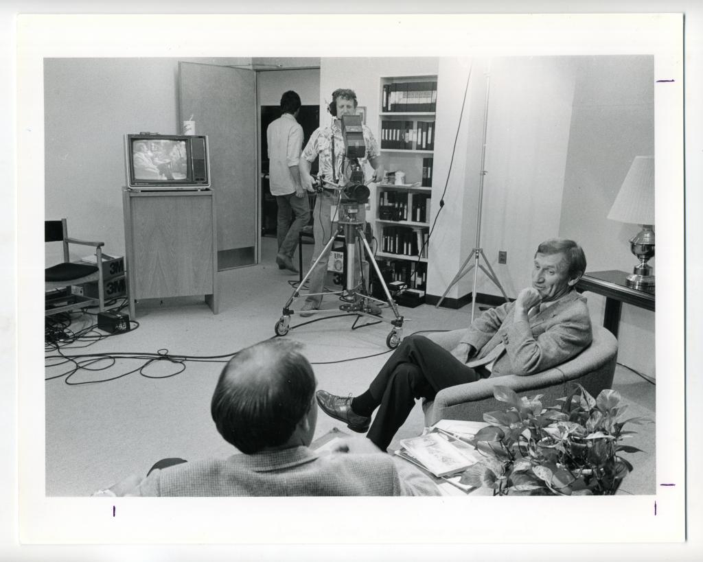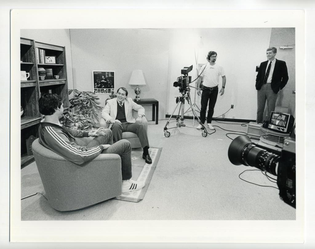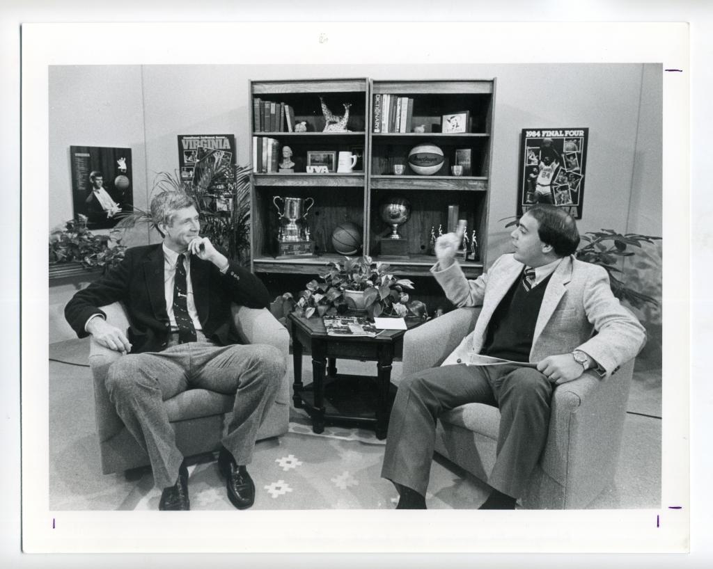 UVA's basketball coach Terry Holland and its football coach George Welsh are interviewed by Mac McDonald in the coaches' show. Media Services Librarian Micheal Klepper and Pete Keyser operate the cameras. Dated 1985.