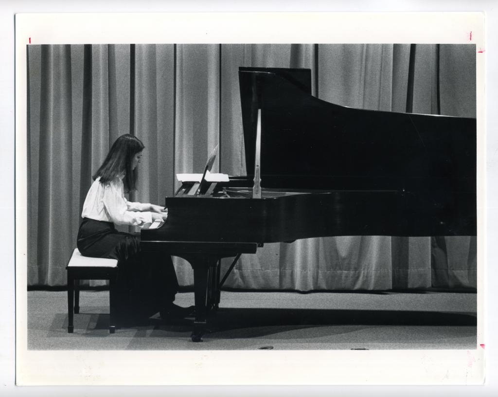 Melanie Macaronis '87 plays at a benefit concert for the Law Library in September of 1986.