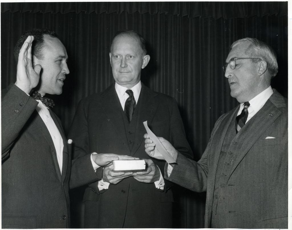 Mortimer Caplin taking the oath as Commissioner of the IRS is sworn by Chief Judge of the U.S. Tax Court J. Edgar Murdock and Secretary of the Treasury C. Douglas Dillon (center).