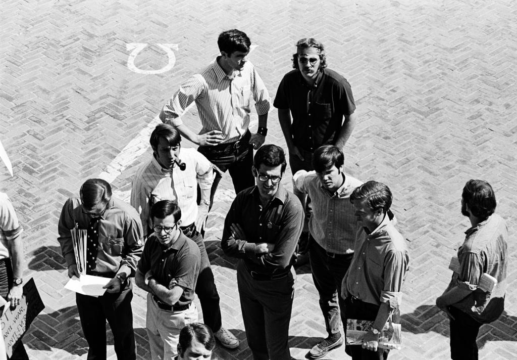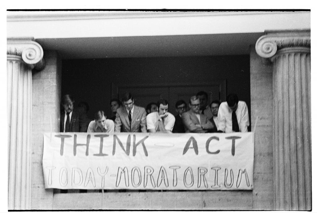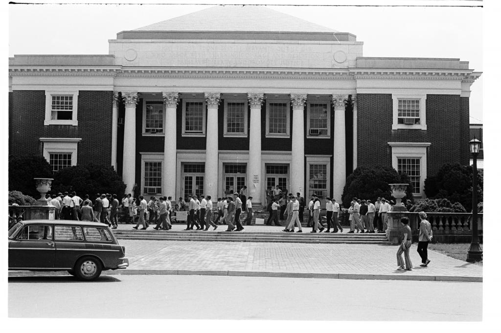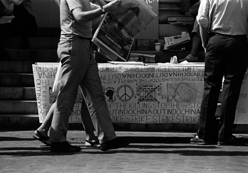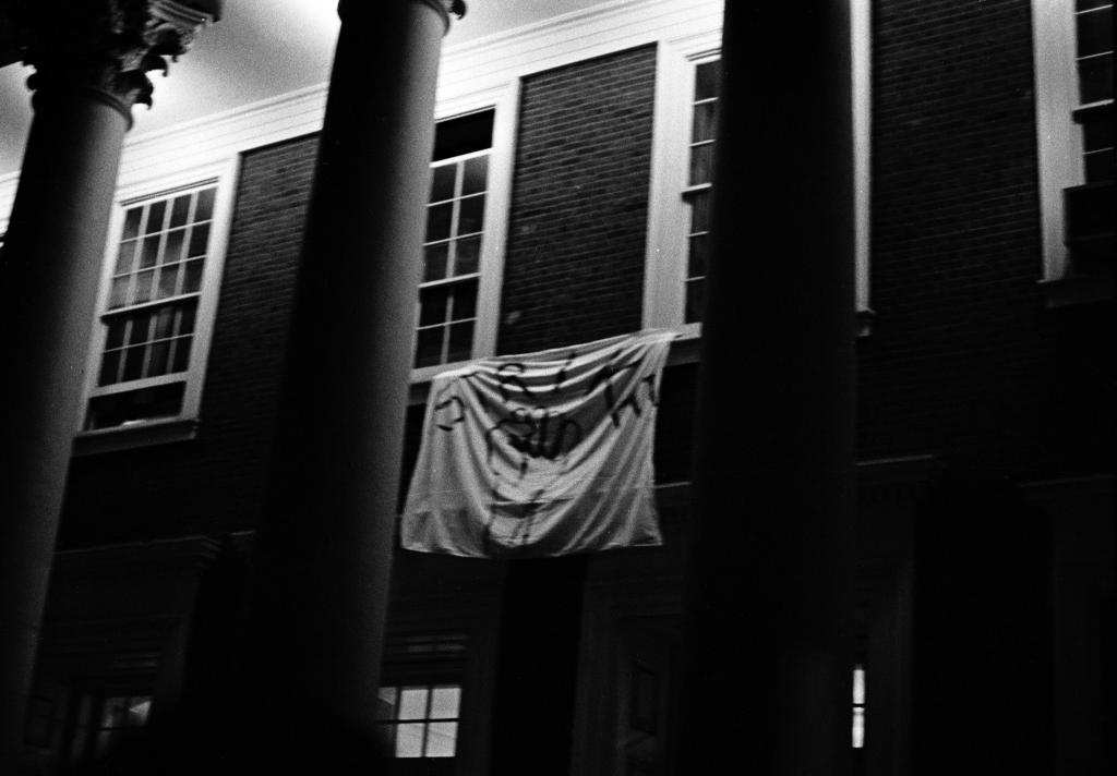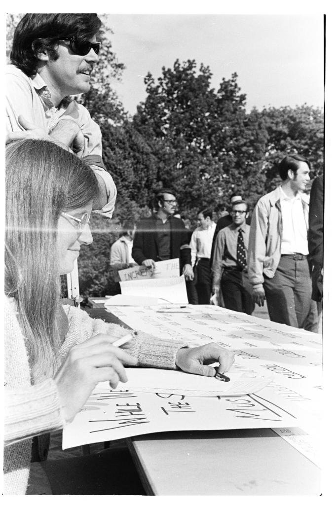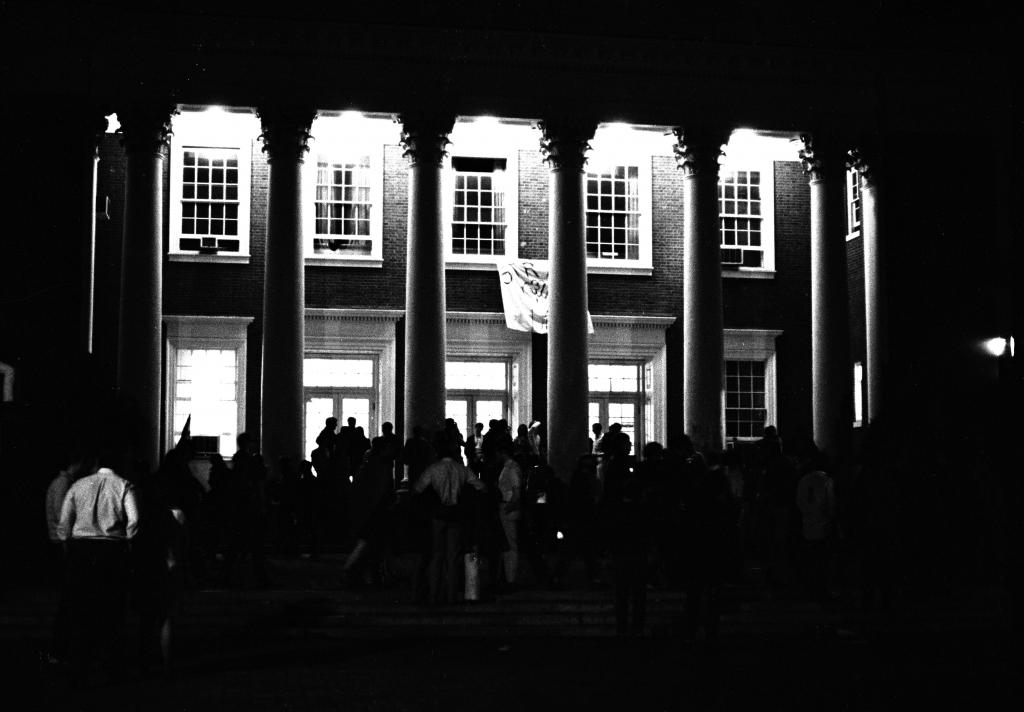 Clark Hall, then home to the School of Law, was a hub of activity during the week of rallies and demonstrations. On Tuesday morning the Law School Boycott Committee rallied in Mural Hall, located inside Clark Hall. That evening, a planned 24-hour “Vigil for Peace” began when a group of about 200 students, predominantly from Law, silently marched around four candles mourning the four slain students at Kent State.