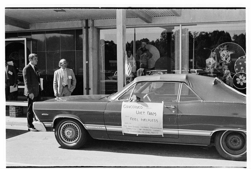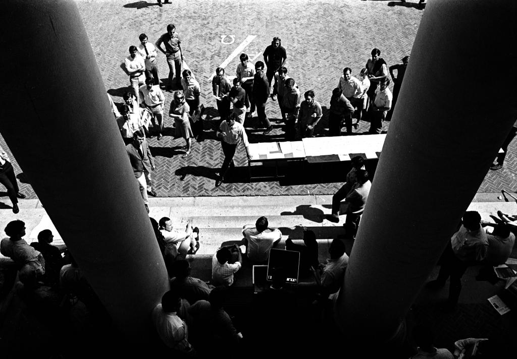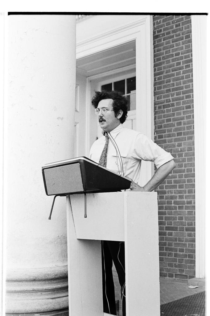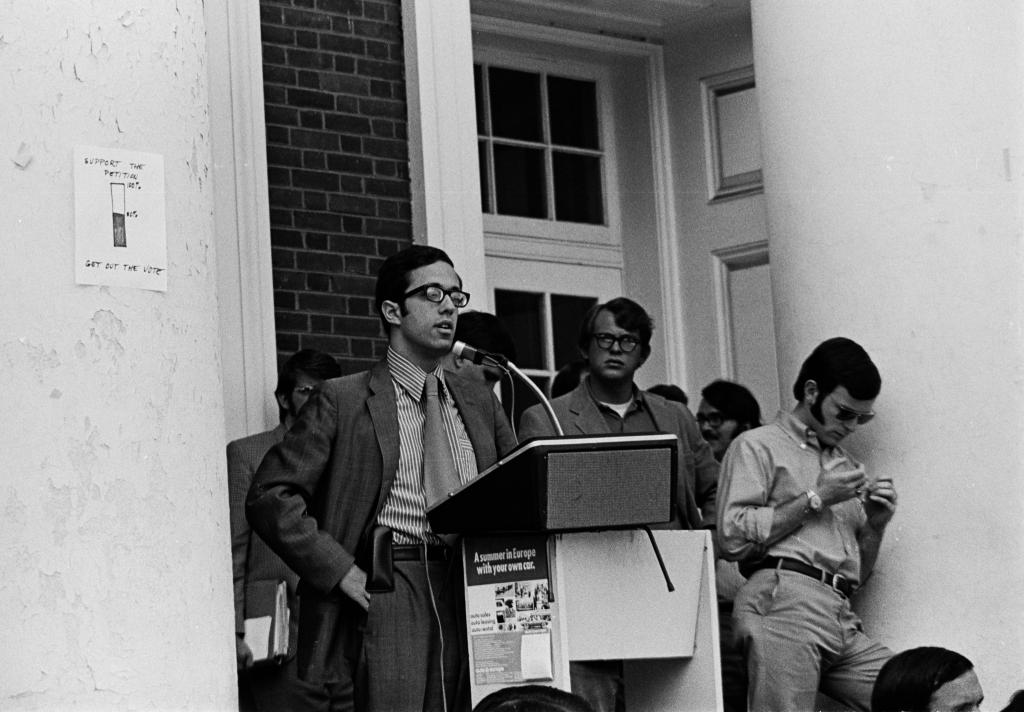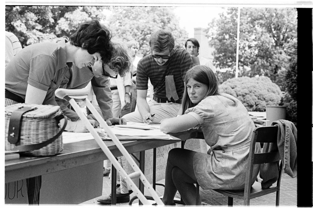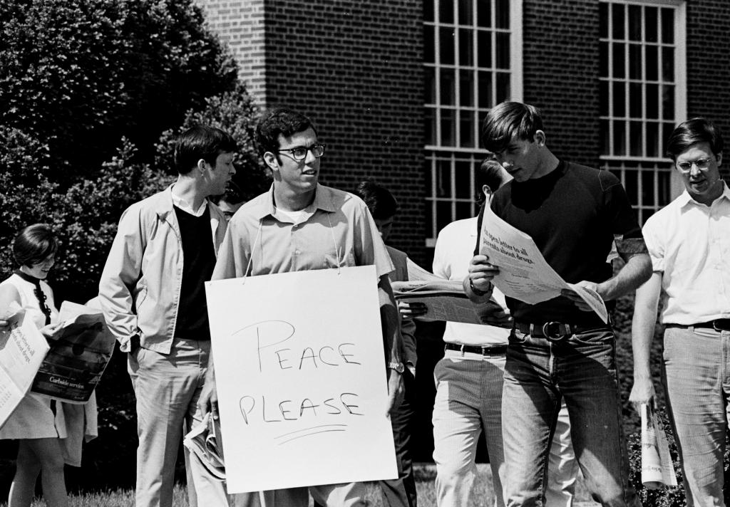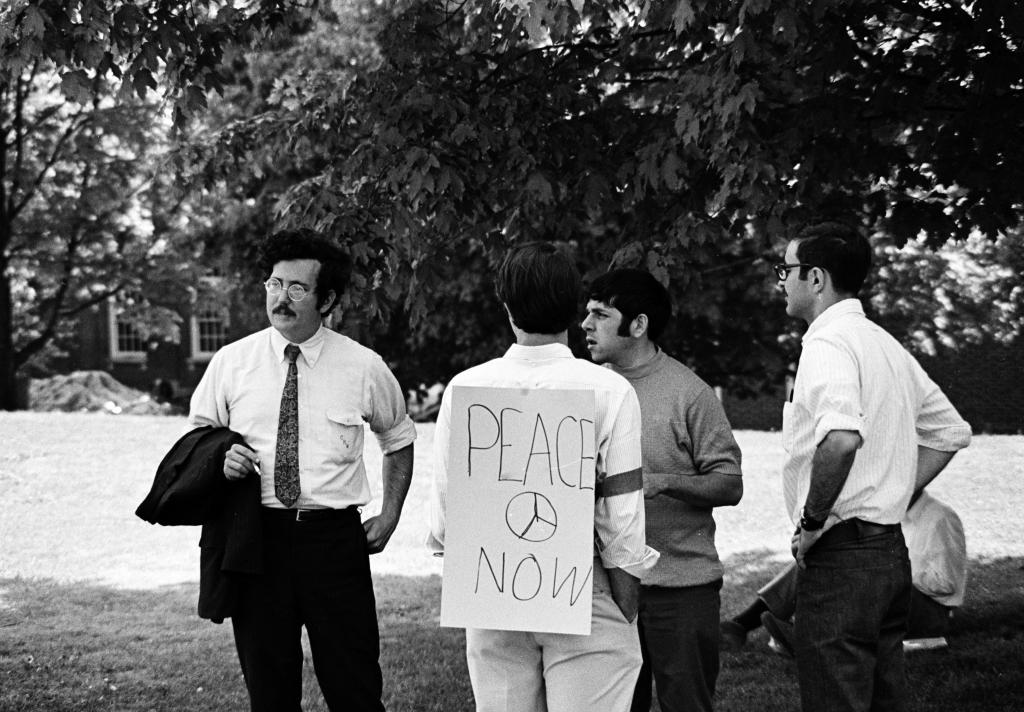 Clark Hall, then home to the School of Law, was a hub of activity during the week of rallies and demonstrations. On Tuesday morning the Law School Boycott Committee rallied in Mural Hall, located inside Clark Hall. That evening, a planned 24-hour “Vigil for Peace” began when a group of about 200 students, predominantly from Law, silently marched around four candles mourning the four slain students at Kent State.